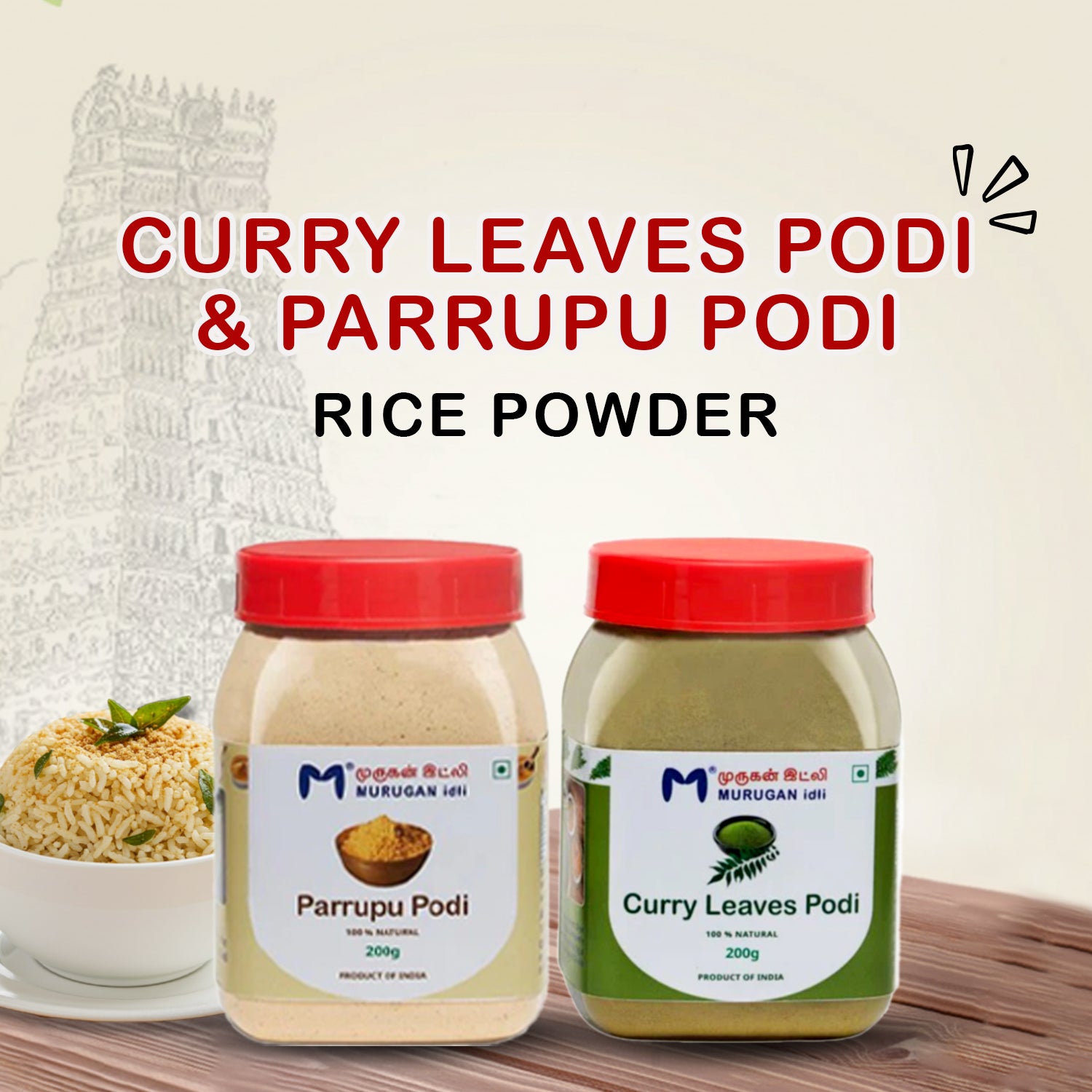 Enjoy the perfect South Indian podi pairing with the Paruppu Podi & Curry Leaves Podi Combo from Murugan Idli.