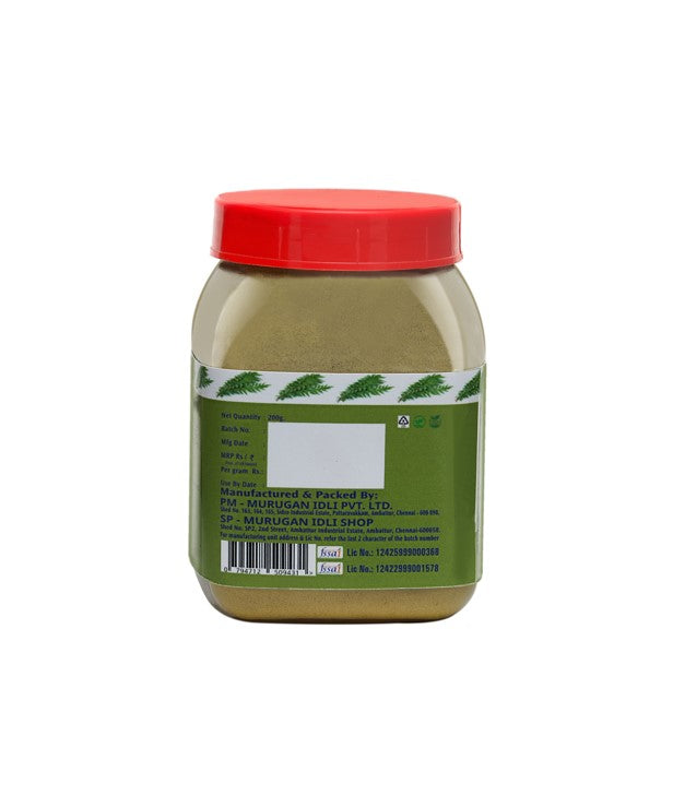 Curry Leaf Podi, also known as Karuveppilai Podi in Tamil, is a flavourful and aromatic spice blend that brings a unique twist to South Indian cuisine. This traditional condiment is made from fresh curry leaves, lentils, and a mix of spices, all roasted and ground to create a coarse, fragrant powder.It's a must-have in any kitchen, offering both taste and health benefits. Whether you're looking to add a traditional touch to your meals or simply spice up your everyday dishes, Curry Leaf Podi is a must-have in every kitchen.