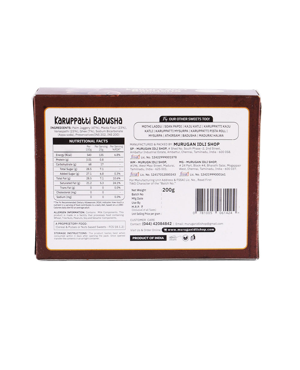 Experience the authentic taste of South India with our Karuppatti Badhusa, a traditional sweet delicacy made from premium ingredients and sweetened with natural palm jaggery (karuppatti). Each bite offers a perfect balance of rich flavours and soft, flaky texture, melting in your mouth to deliver a truly indulgent treat. Perfect for festive occasions, gifting, or satisfying your sweet cravings with a healthier twist! Order now and relish this traditional treat, delivered fresh to your doorstep. Net Weight: 200gm Shelf Life: 90 days when stored as recommended.